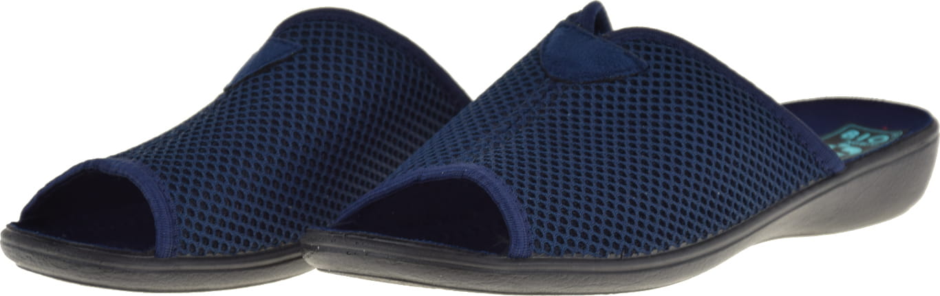 Te granatowe klapki to połączenie nowoczesnego designu i ponadczasowego stylu. Uniwersalny kolor sprawia, że doskonale komponują się zarówno z domowym outfitem, jak i z bardziej eleganckimi zestawami na wyjście do sklepu, pracy czy spotkanie ze znajomymi. Modna siateczkowa cholewka nadaje im lekkości i przewiewności, a otwarty przód subtelnie eksponuje palce i zapewnia świeżość.
