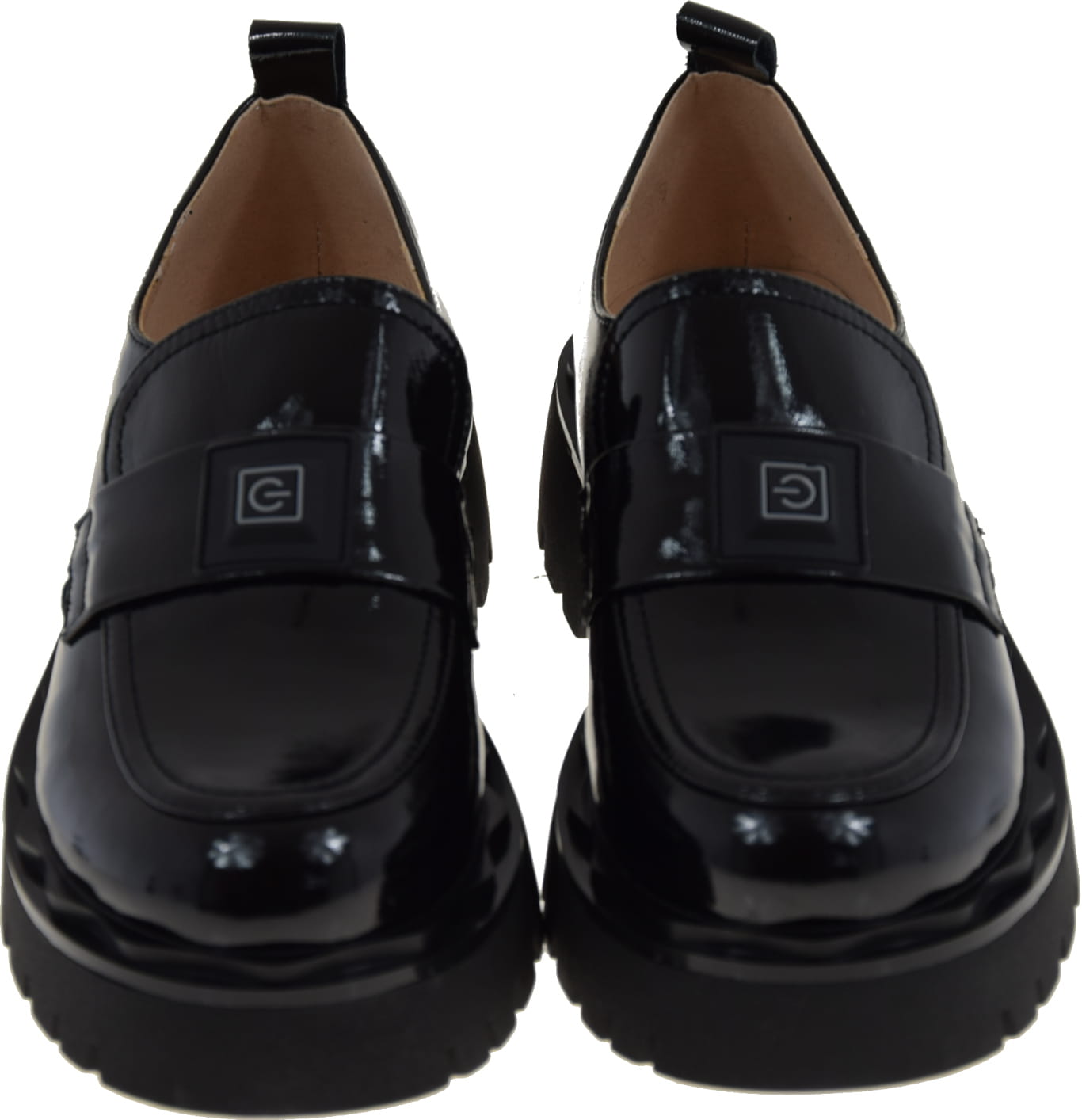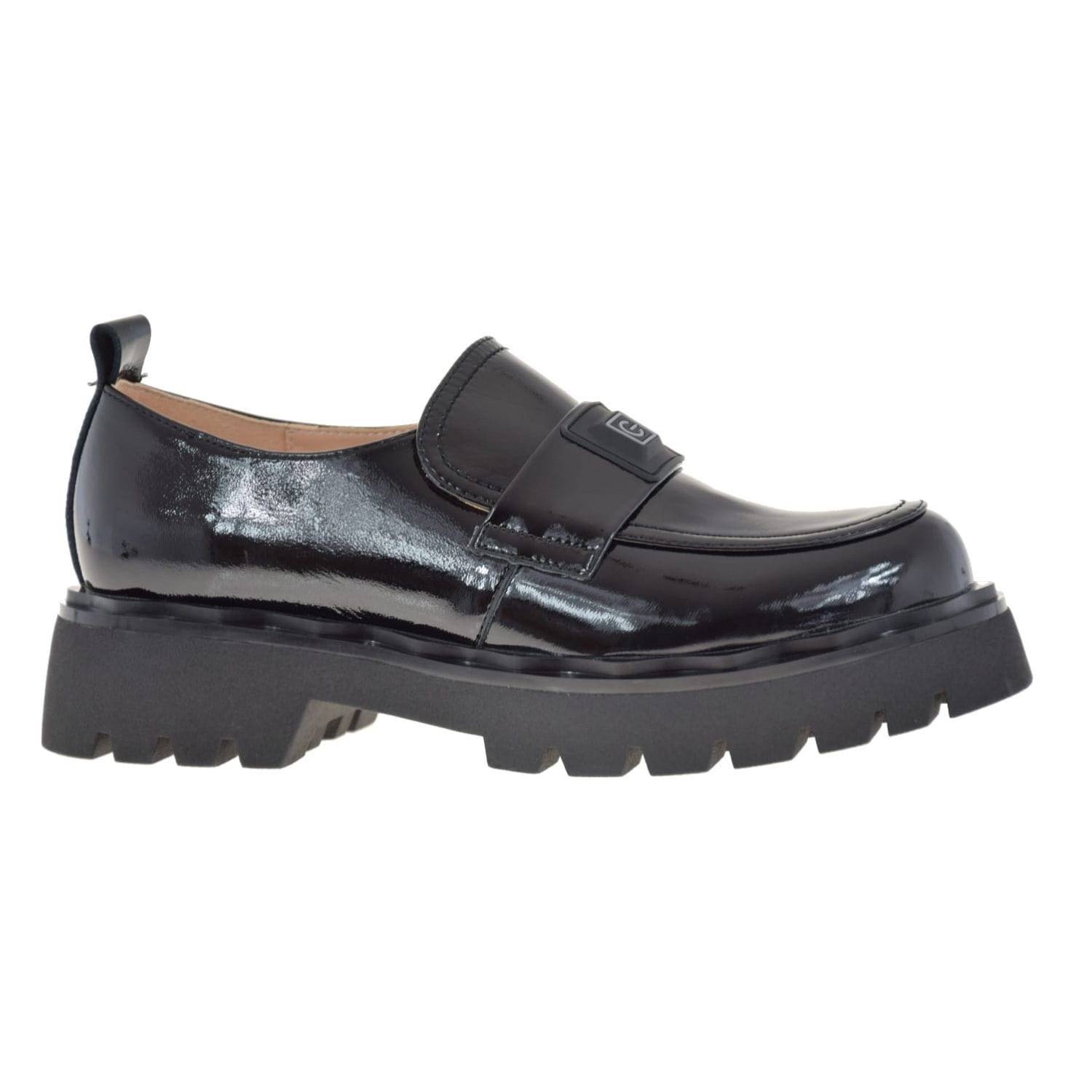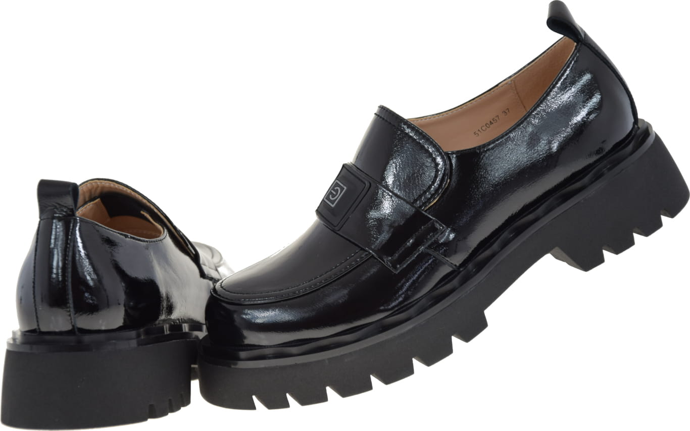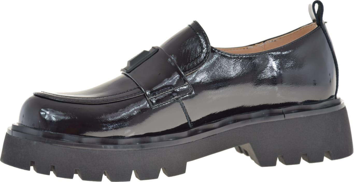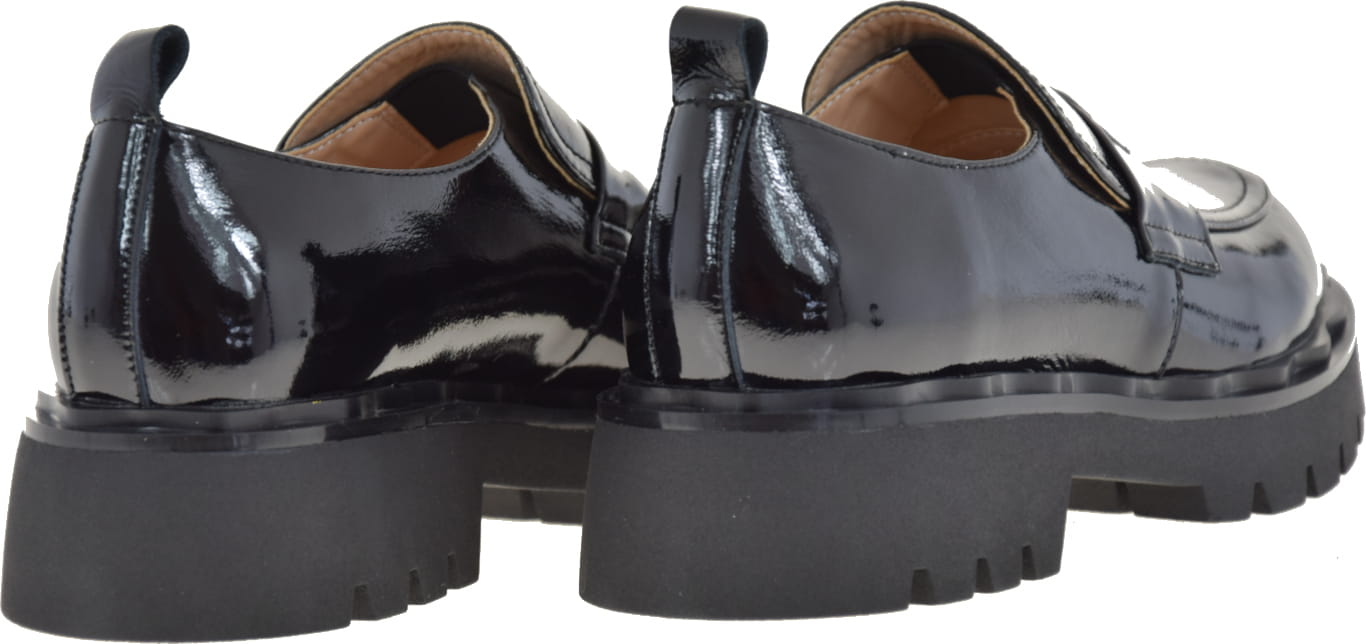 Mokasyny na grubej podeszwie prezentują się elegancko dzięki czarnemu lakierkowi typu naplak, który jest najmodniejszym trendem tego sezonu. Bez żadnych dodatków w innym kolorze, te półbuty doskonale dopasują się do każdej stylizacji.