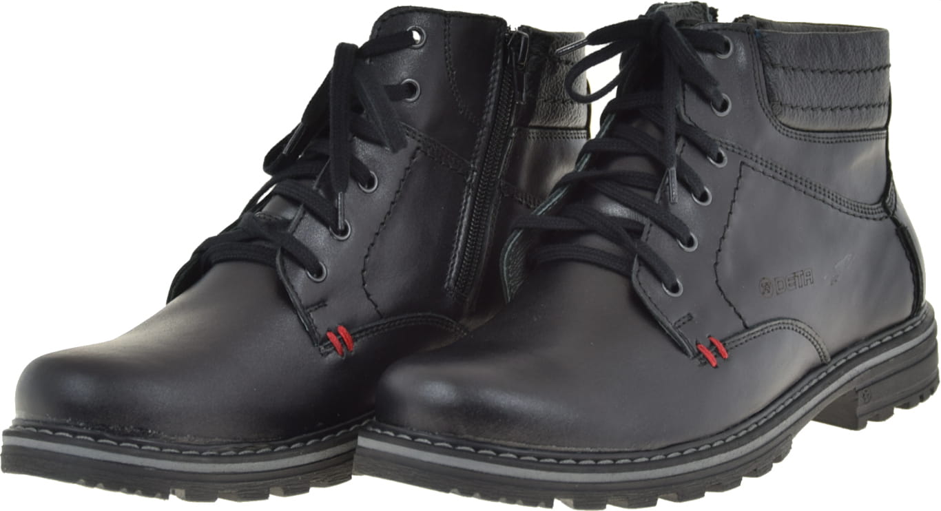 Te trzewiki zostały wykonane z naturalnej, wysokogatunkowej skóry licowej w klasycznym czarnym kolorze. Dzięki temu są nie tylko trwałe i solidne, ale także prezentują się ekskluzywnie. Nosek okrągły i zakryta usztywniona pięta zapewniają świetne dopasowanie i komfort chodzenia. To obuwie od najlepszych marek, które gwarantuje gwarancję trwałości.