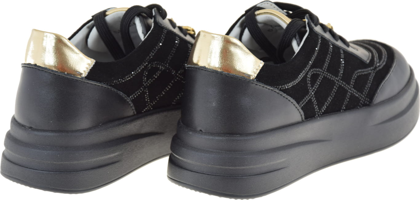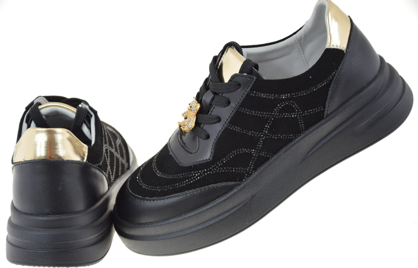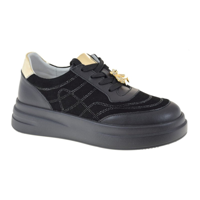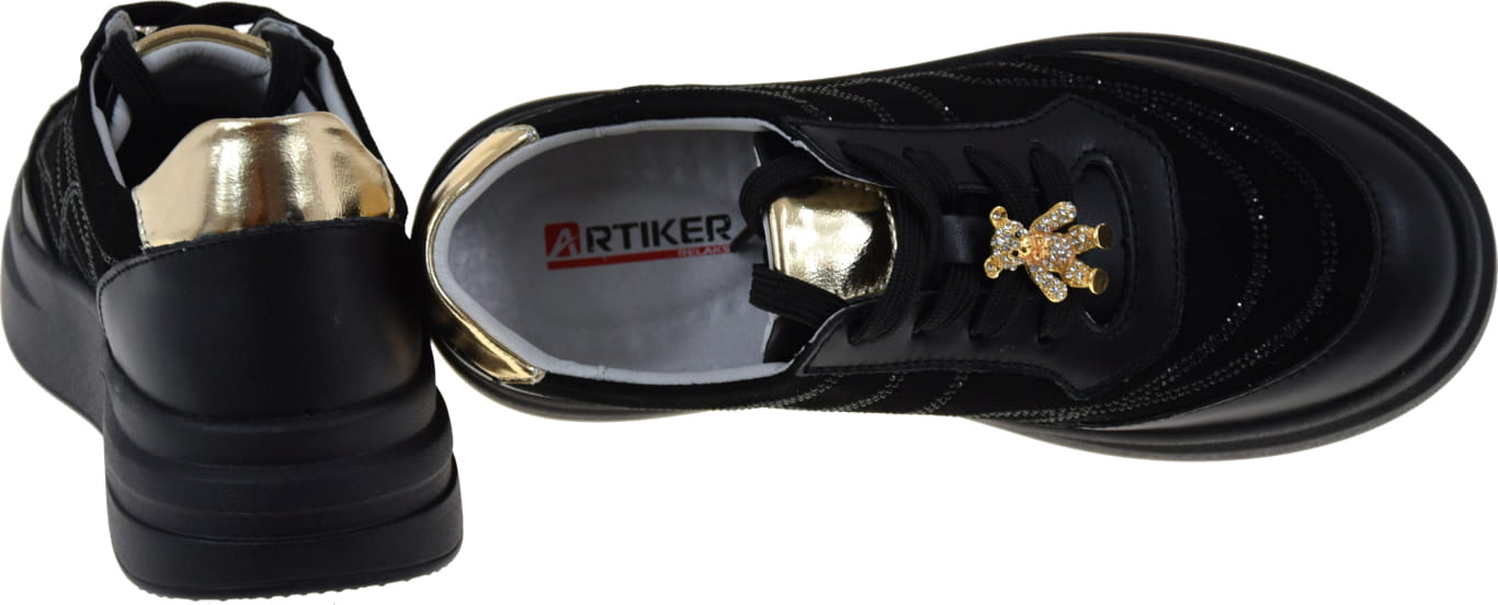 Półbuty Artiker 54C1874 wykonane są z wysokiej jakości skóry, co gwarantuje ich trwałość oraz komfort noszenia. Charakterystyczne zdobienia w postaci delikatnych cyrkonii i złotych akcentów na tylnej części buta oraz języku, dodają im subtelnego blasku i ekskluzywnego wyglądu. Złoty element na sznurówkach stanowi wyjątkową ozdobę, która przyciąga wzrok, czyniąc obuwie wyjątkowym dodatkiem do każdej garderoby.