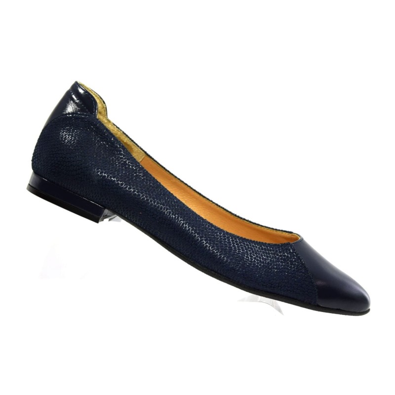 Nasze baleriny damskie to połączenie elegancji i wygody. Wykonane są z granatowej skóry typu tejus, która została wytłaczana w modny, zwierzęcy wzór, nadając butom niepowtarzalny charakter. Licowy noski oraz licowe wstawki z tyłu buta dodają im szyku i klasy. To obuwie, które z pewnością przyciąga uwagę i pozwala poczuć się wyjątkowo.