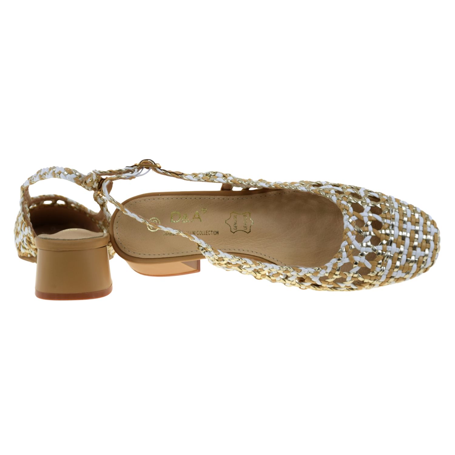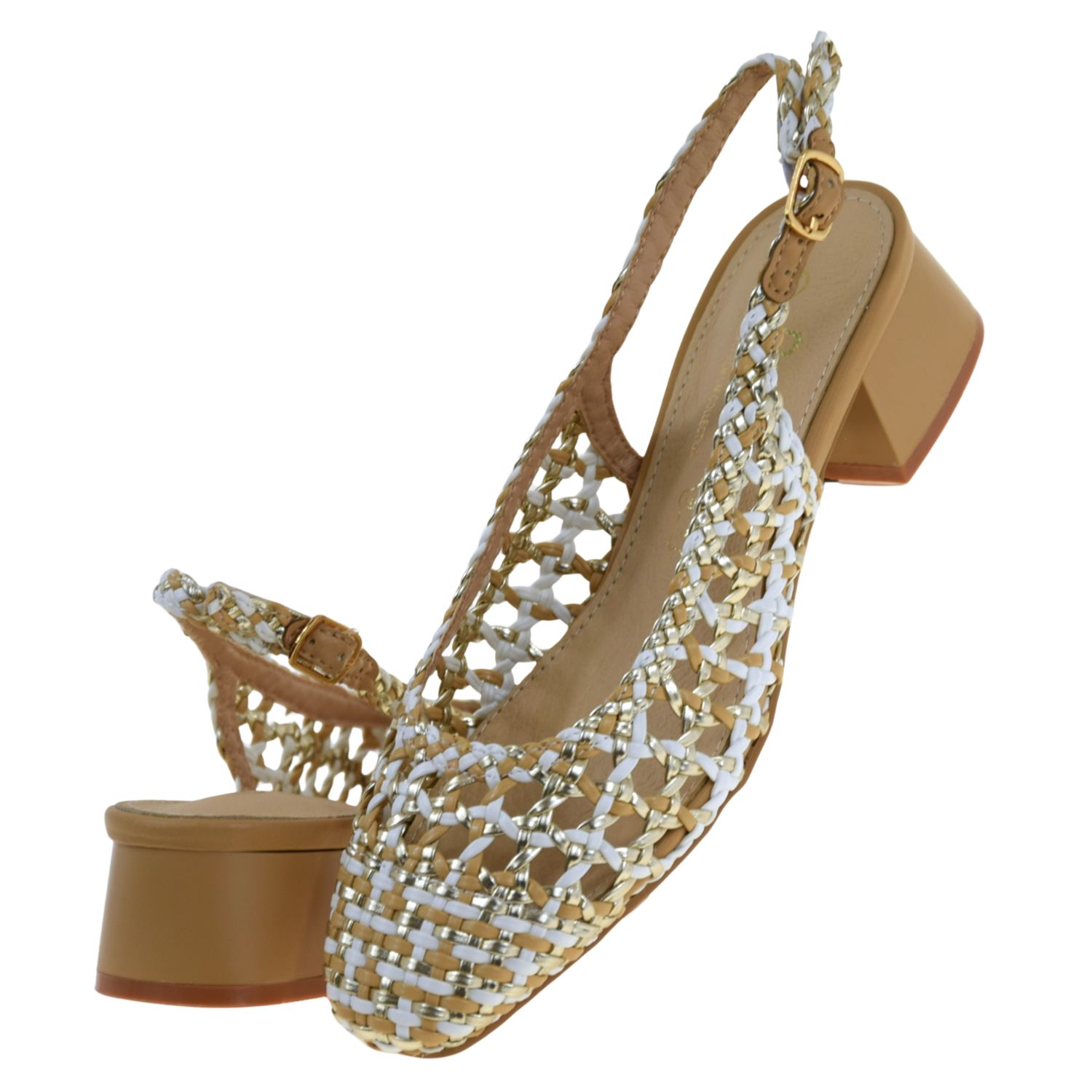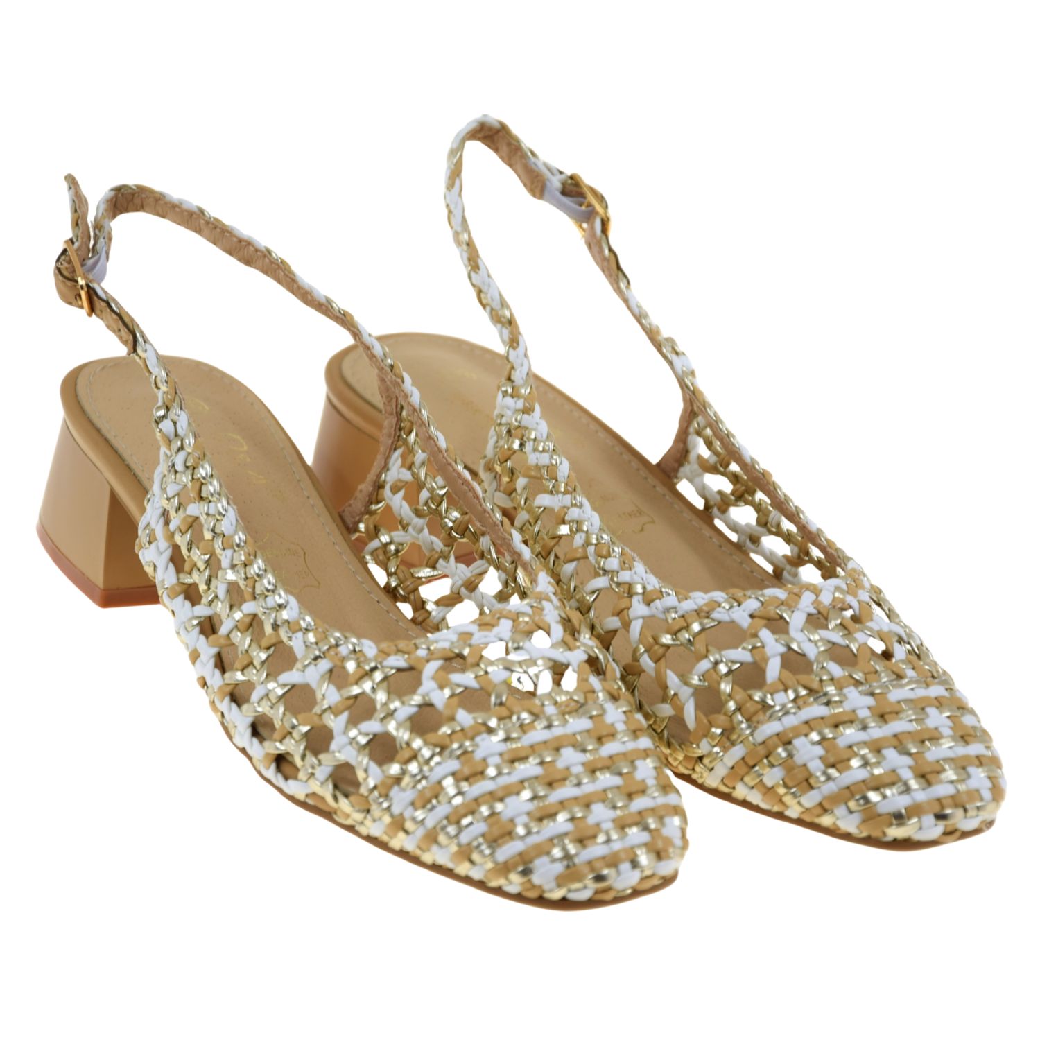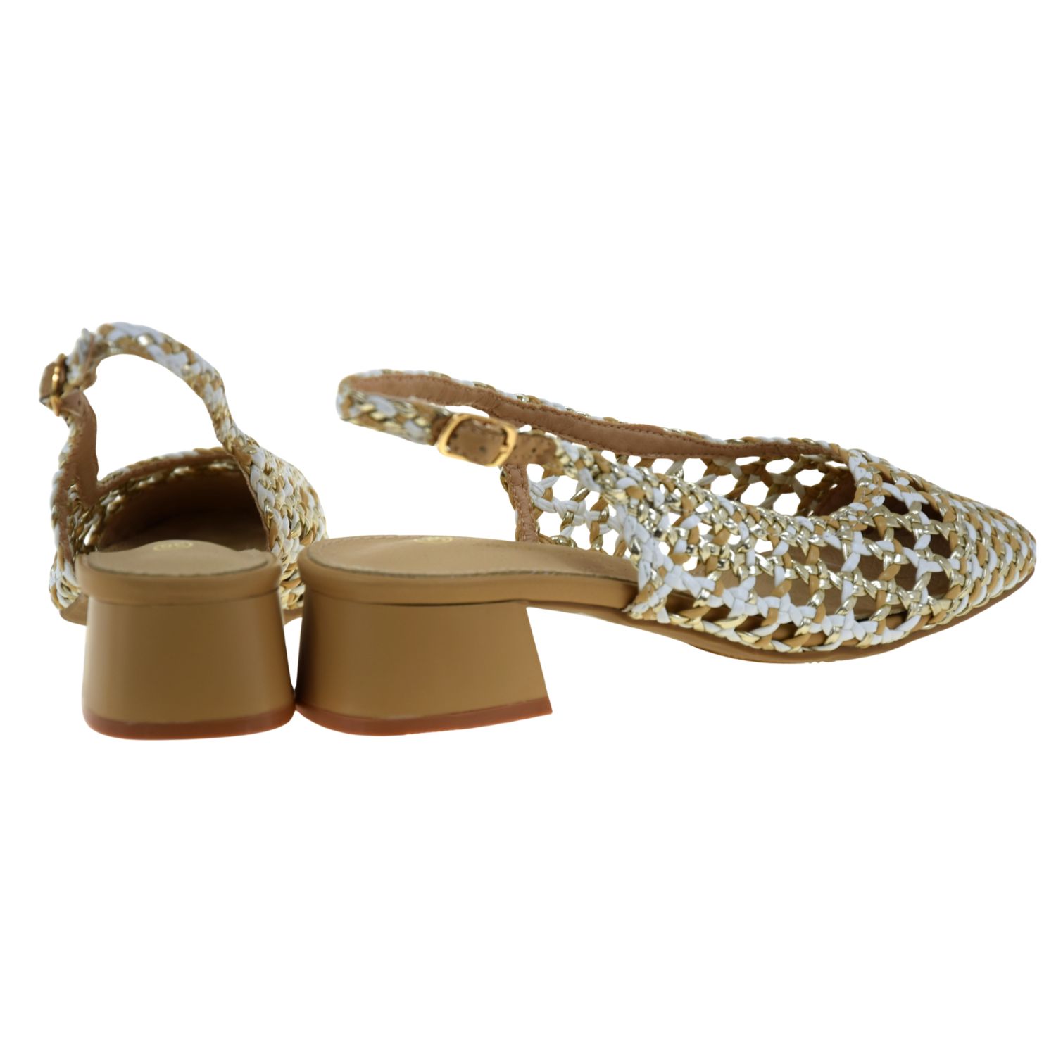 Czółenka slingback plecione złoto-białe na niskim słupku S.BARSKI SR61-0100 – eleganckie czółenka damskie na lato i na co dzień