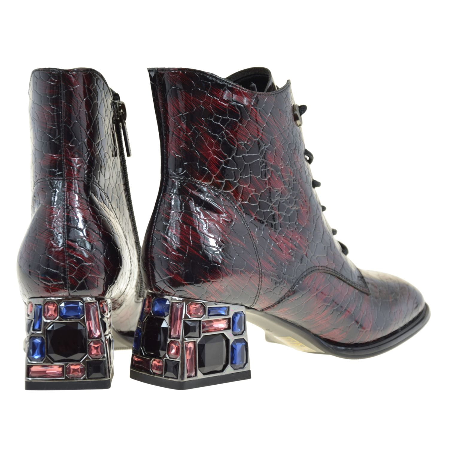 Te botki damskie na słupku zachwycają eleganckim, okrągłym noskiem oraz unikalnym obcasem ozdobionym kolorowymi kamieniami w odcieniach czerwieni, granatu i czerni. To nietuzinkowy akcent, który dodaje im luksusowego charakteru i podkreśla modny styl.