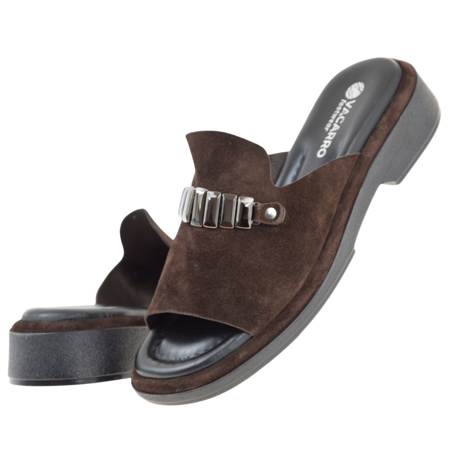 Eleganckie klapki damskie VACARRO 62 358-05 to model stworzony dla kobiet, które cenią połączenie modnego wyglądu, komfortu i wysokiej jakości wykonania. Te brązowe klapki damskie w głębokim, czekoladowym odcieniu prezentują się niezwykle szykownie i ponadczasowo. Wykonane z naturalnej skóry zamszowej, przyciągają uwagę subtelną fakturą oraz efektowną, srebrną ozdobą na cholewce, która nadaje całości eleganckiego charakteru.