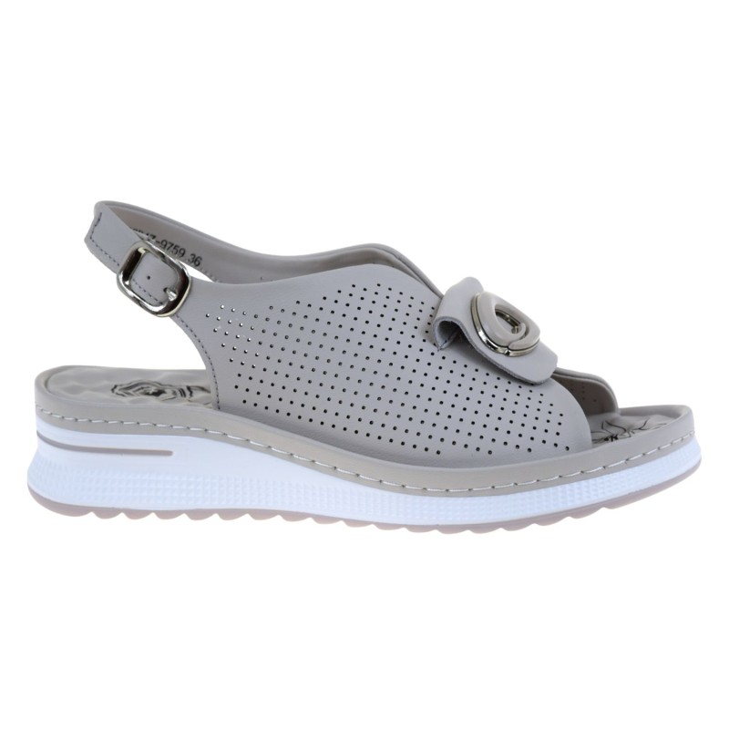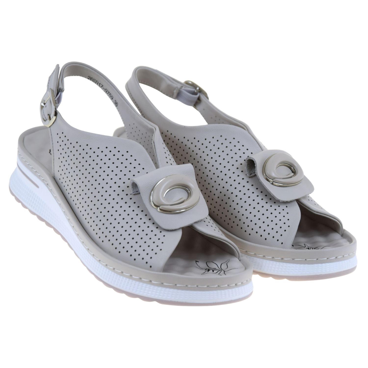Eleganckie sandały damskie na koturnie EVENTO 9759 to propozycja dla kobiet, które chcą połączyć modny wygląd z wygodą noszenia. Ten model został wykonany z naturalnej skóry licowej w subtelnym, uniwersalnym beżowym kolorze, który pięknie komponuje się z letnią garderobą. Delikatna perforacja nadaje obuwiu lekkości i nowoczesnego charakteru, a ozdobny detal na cholewce podkreśla jego szykowny styl. To beżowe sandały damskie, które świetnie prezentują się zarówno z sukienką, spodniami materiałowymi, jak i eleganckimi jeansami.