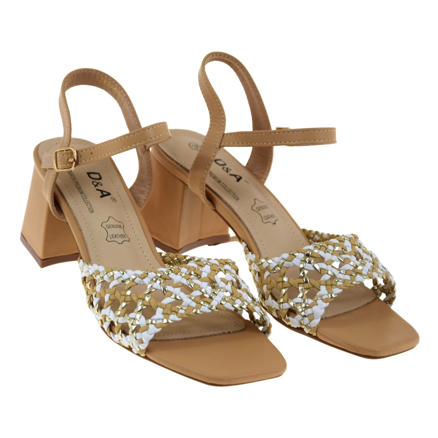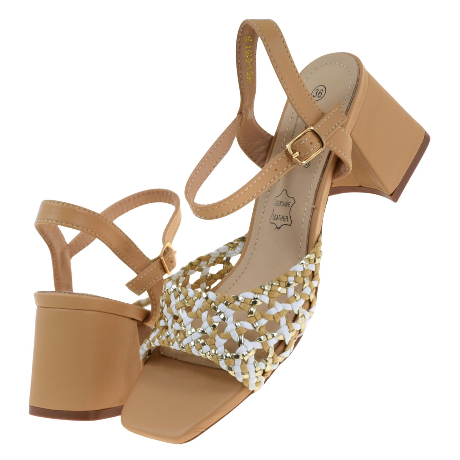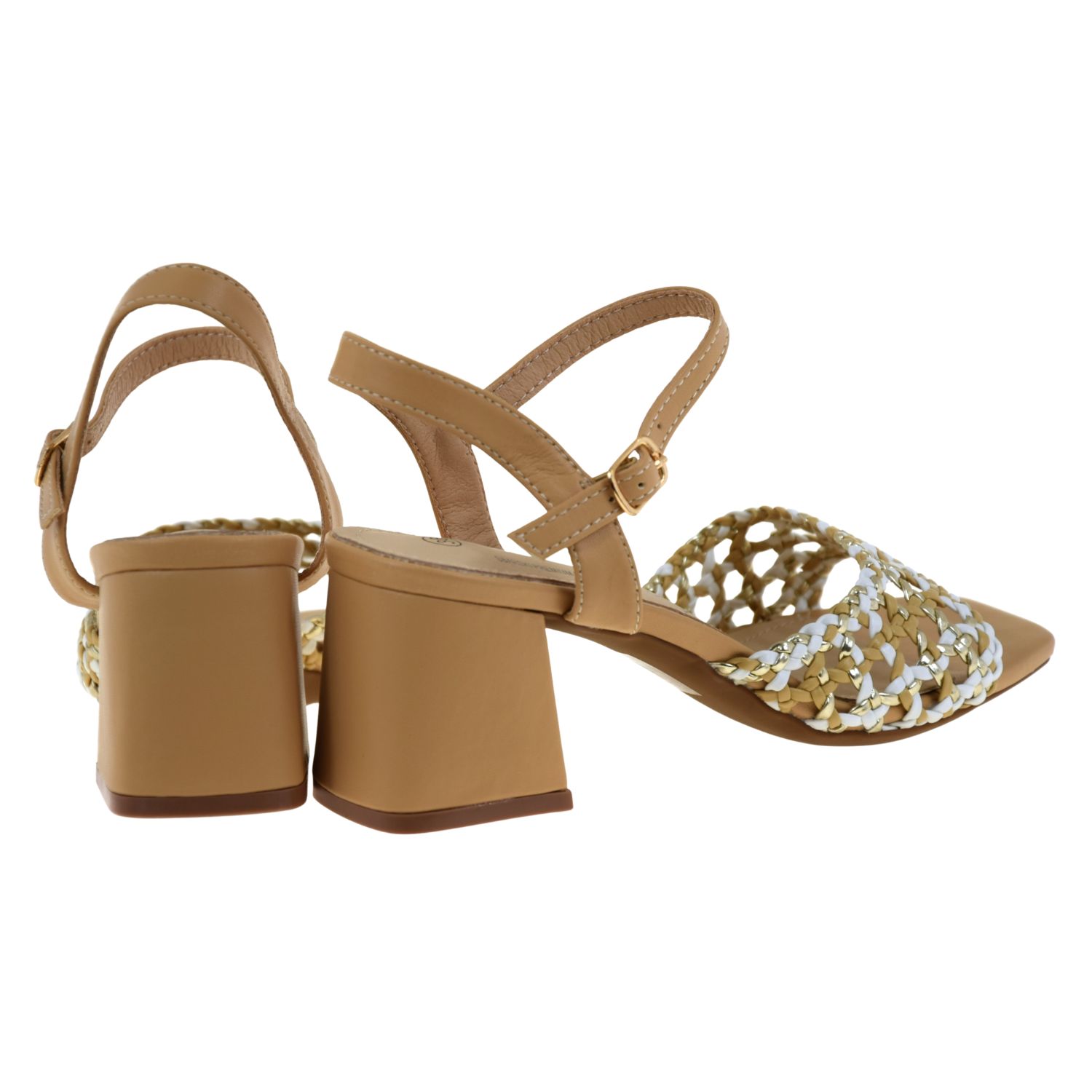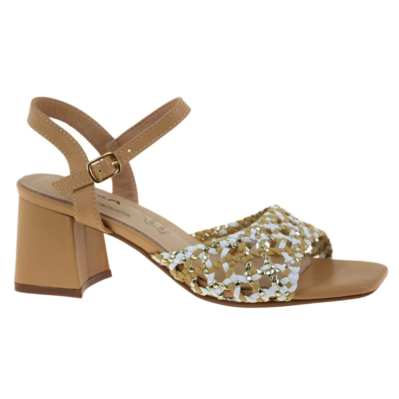 Eleganckie sandały damskie plecione beżowo-złoto-białe na słupku – sandały na lato S.BARSKI SR61-0101