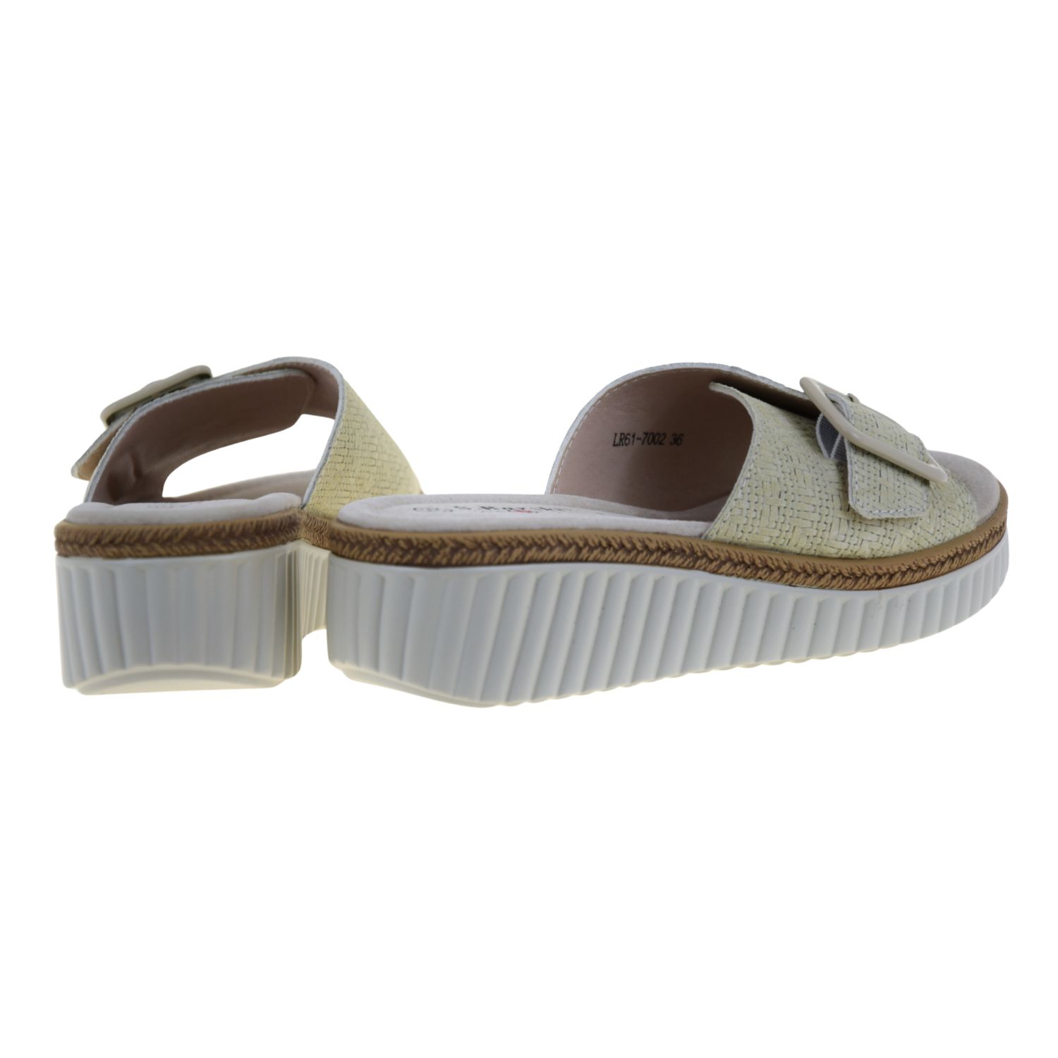 Te klapki z naturalnej skóry damskie zostały wykonane z wysokiej jakości skóry licowej w beżowym kolorze. Naturalny materiał nie tylko prezentuje się wyjątkowo estetycznie, ale także wpływa na komfort użytkowania i trwałość obuwia. Wkładka z naturalnej skóry, dobrze wyprofilowana i osadzona na miękkiej piance, zapewnia przyjemne podparcie stopy podczas chodzenia. Dzięki temu model LR61-7002 doskonale sprawdzi się podczas dłuższego noszenia w ciepłe dni.