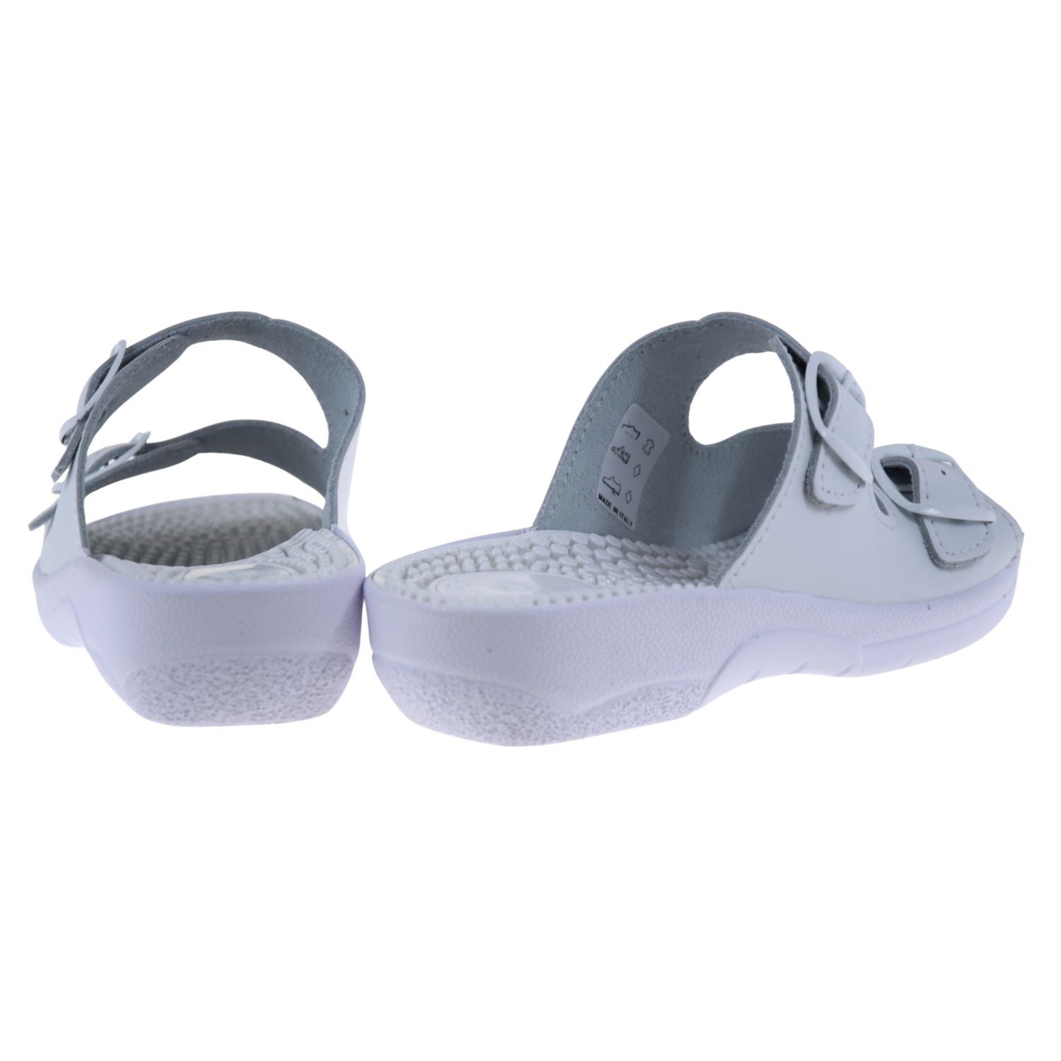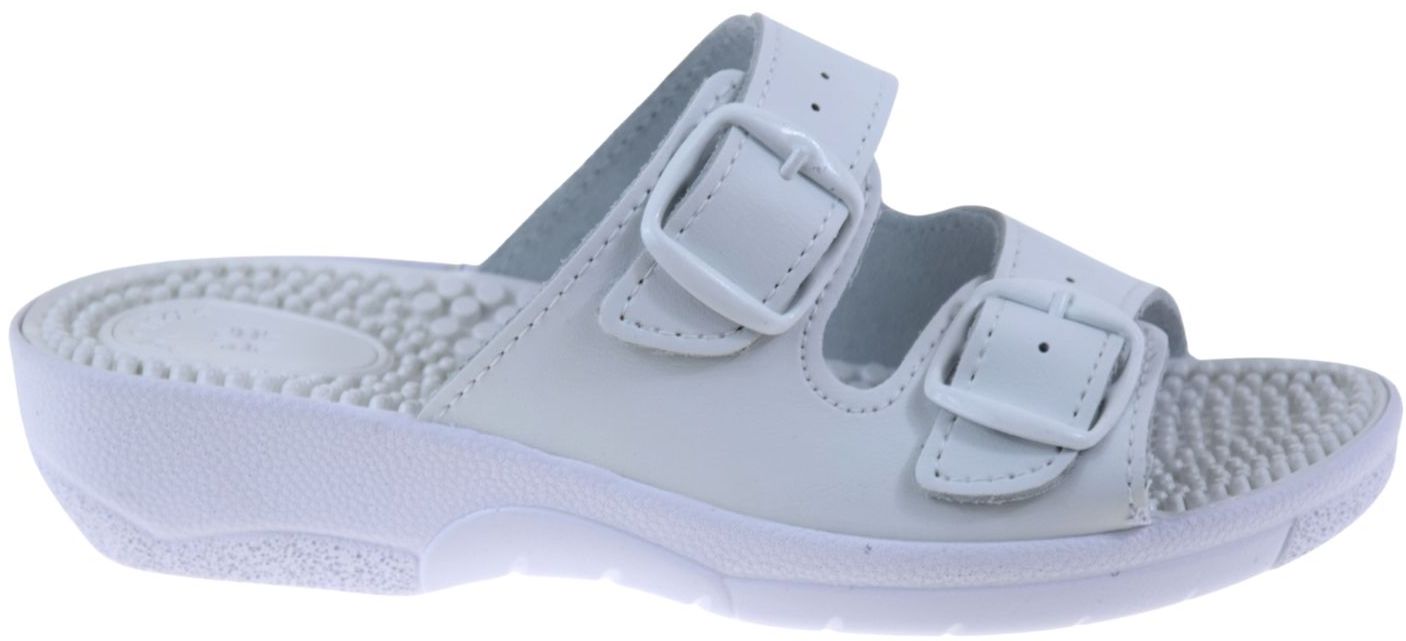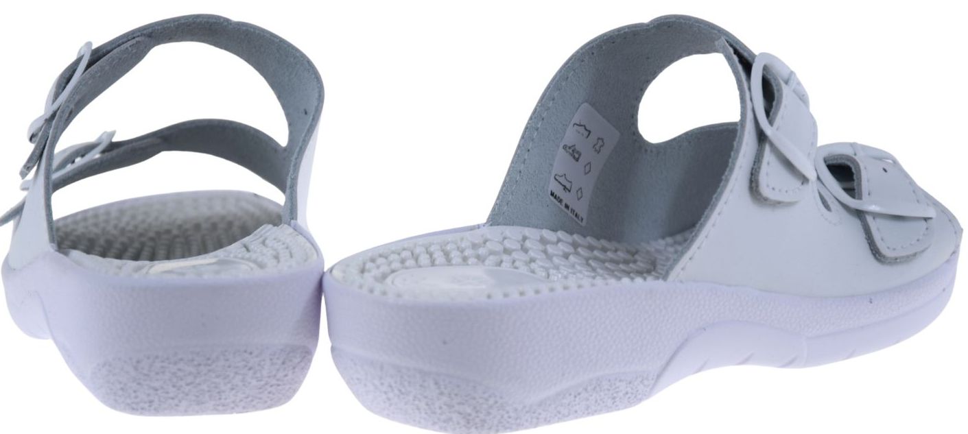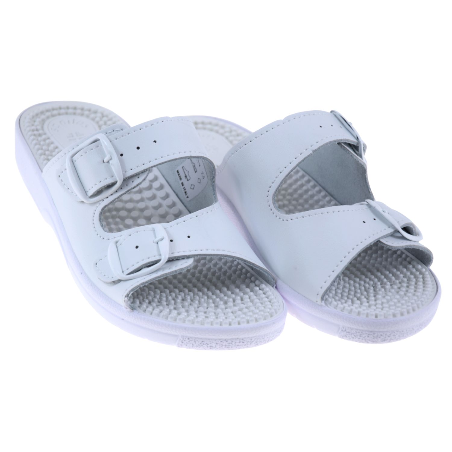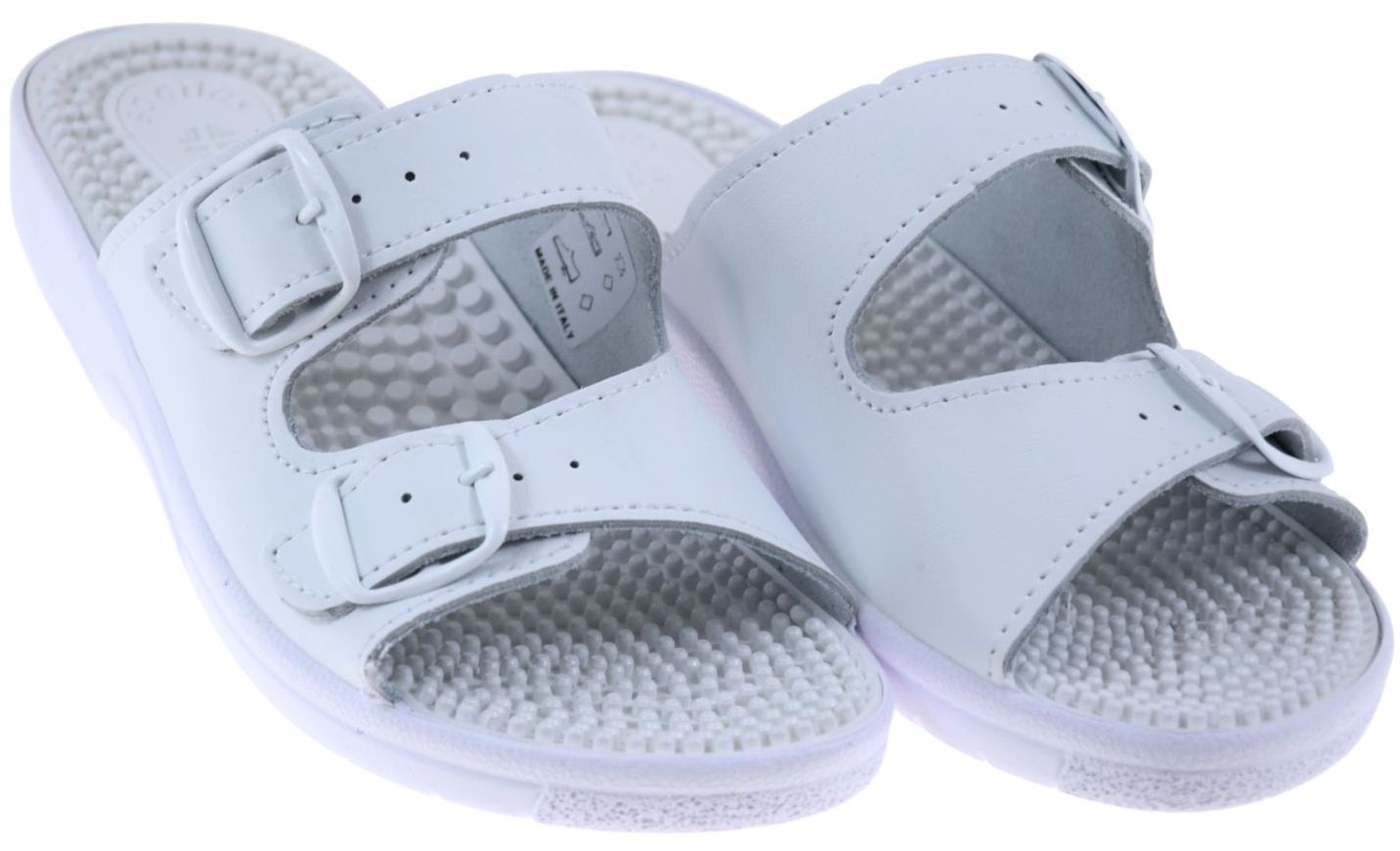 Klapki damskie skórzane medyczne białe fakirki masujące z kolcami COMFOOTY NADIA – wygodne klapki damskie na lato i do pracy