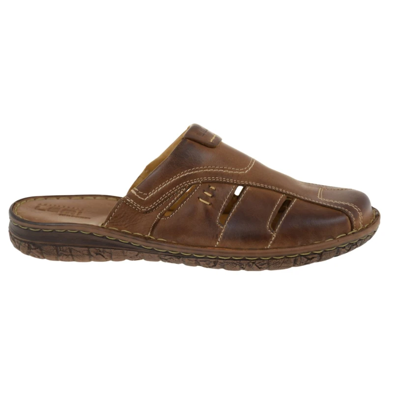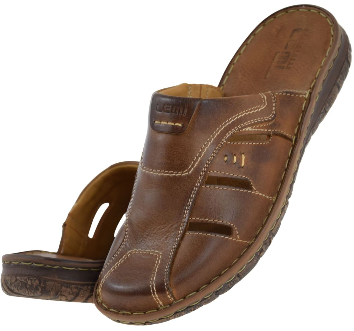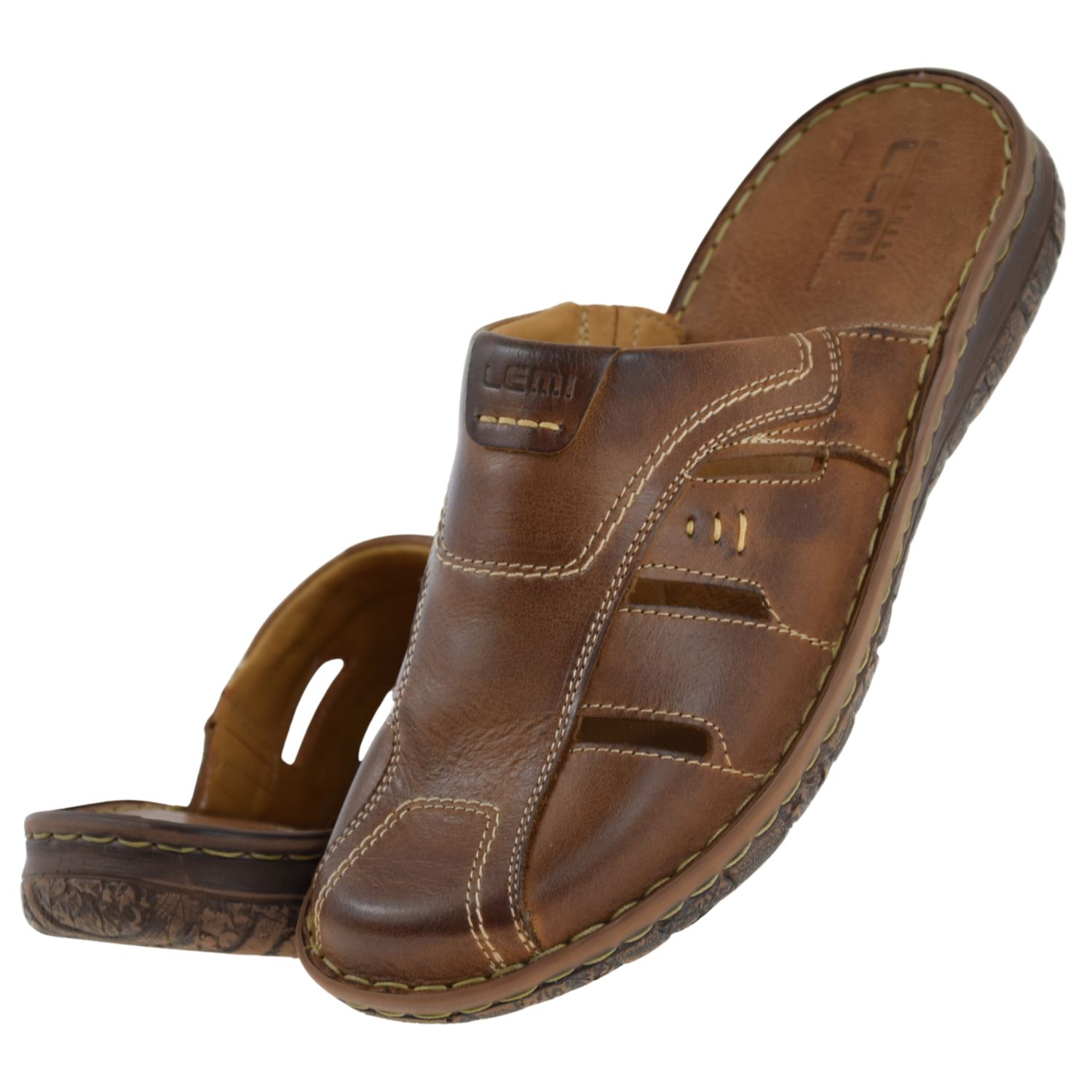 Model LEMI 601 wyróżnia się okrągłym noskiem, kontrastowymi przeszyciami i praktyczną tęgością G 1/2. To świetny wybór dla osób szukających fraz: brązowe klapki męskie, wygodne klapki skórzane, klapki męskie wsuwane, klapki męskie na lato.