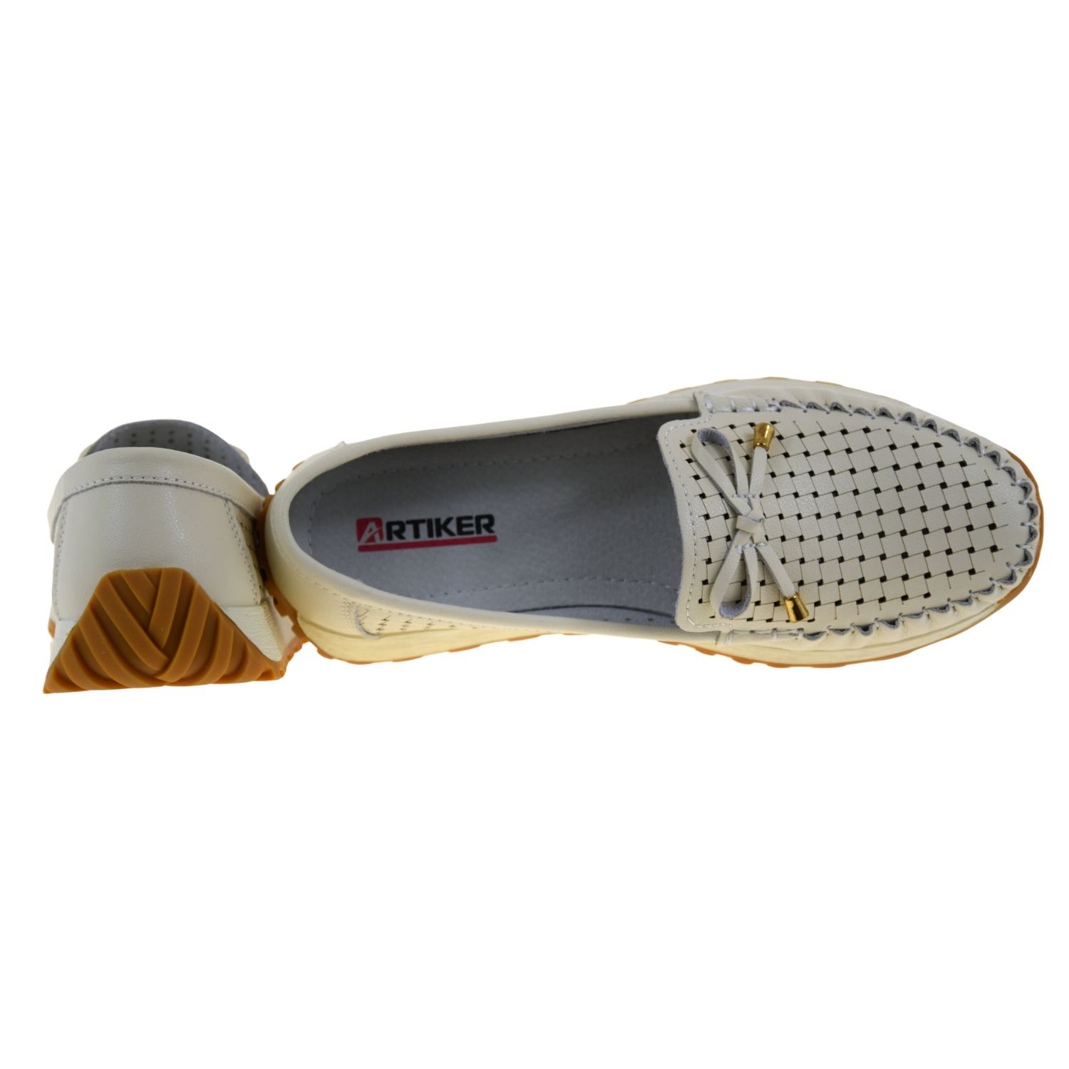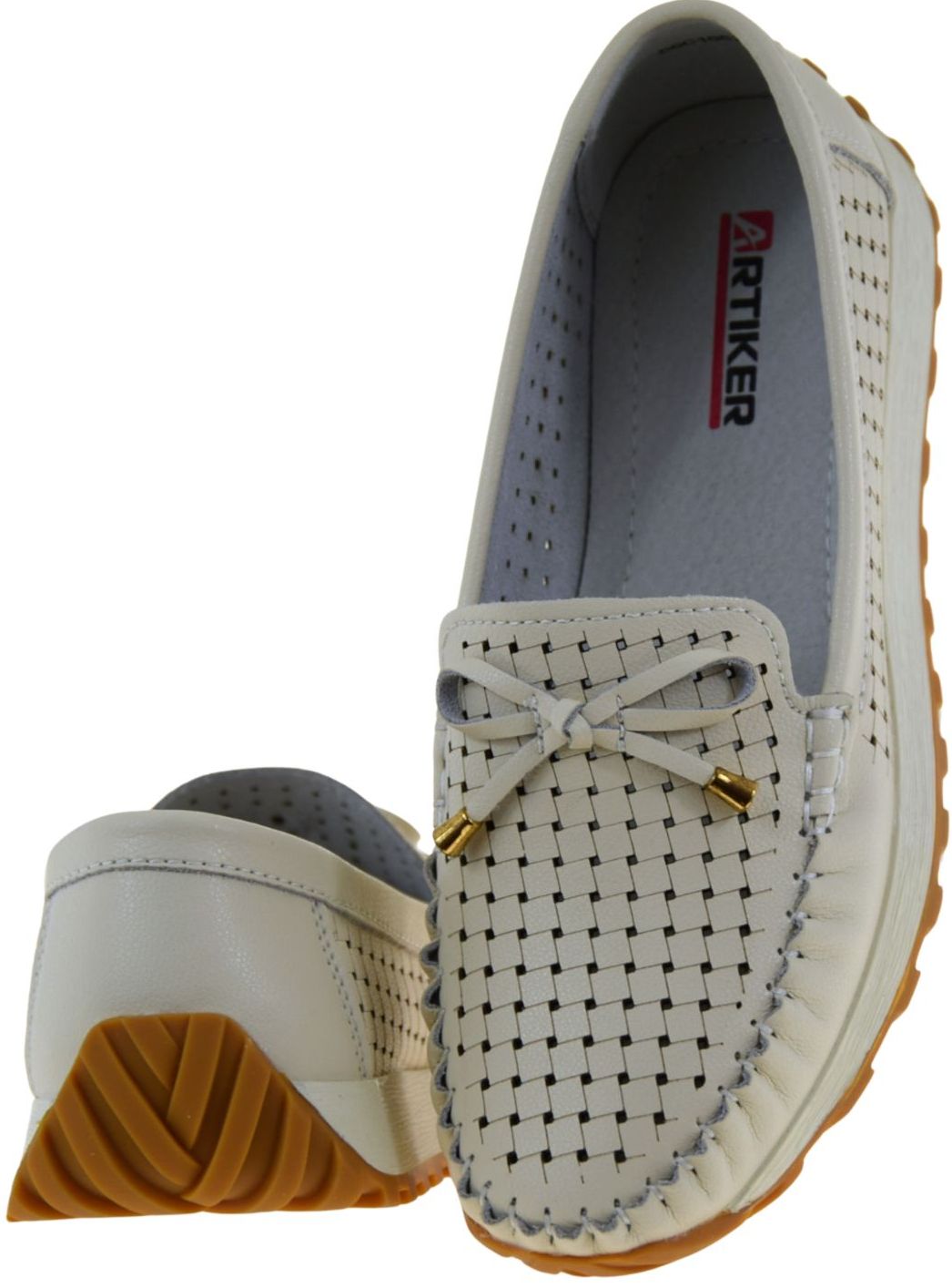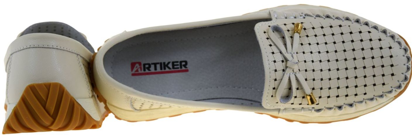 Model ARTIKER 56C1852 to beżowe mokasyny damskie w stylu lordsów, które łączą modny wygląd z codziennym komfortem. Ażurowa cholewka z naturalnej skóry nadaje butom lekkości i subtelnej elegancji, a ozdobna kokardka ze złotym wykończeniem podkreśla kobiecy charakter fasonu.