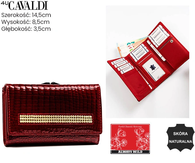 Ten portfel damski skórzany wyróżnia się głęboką, lakierowaną czerwienią i modnym tłoczeniem inspirowanym skórą krokodyla. Z przodu uwagę zwraca subtelne zdobienie w postaci pasma błyszczących elementów, które dodaje całości biżuteryjnego charakteru — idealnie do stylizacji eleganckich i codziennych.
