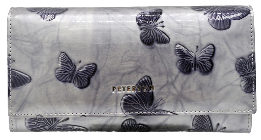 Portfel damski skórzany PTN 42122-BF Silver od PETERSON to połączenie elegancji i praktyczności. Srebrzysta kolorystyka z subtelnym efektem marmurkowym oraz wytłaczane motyle nadają mu kobiecego, biżuteryjnego charakteru. Całość dopełnia złote logo na froncie, a zamknięcie na klapkę ze zatrzaskiem trzyma zawartość bezpiecznie w ryzach.