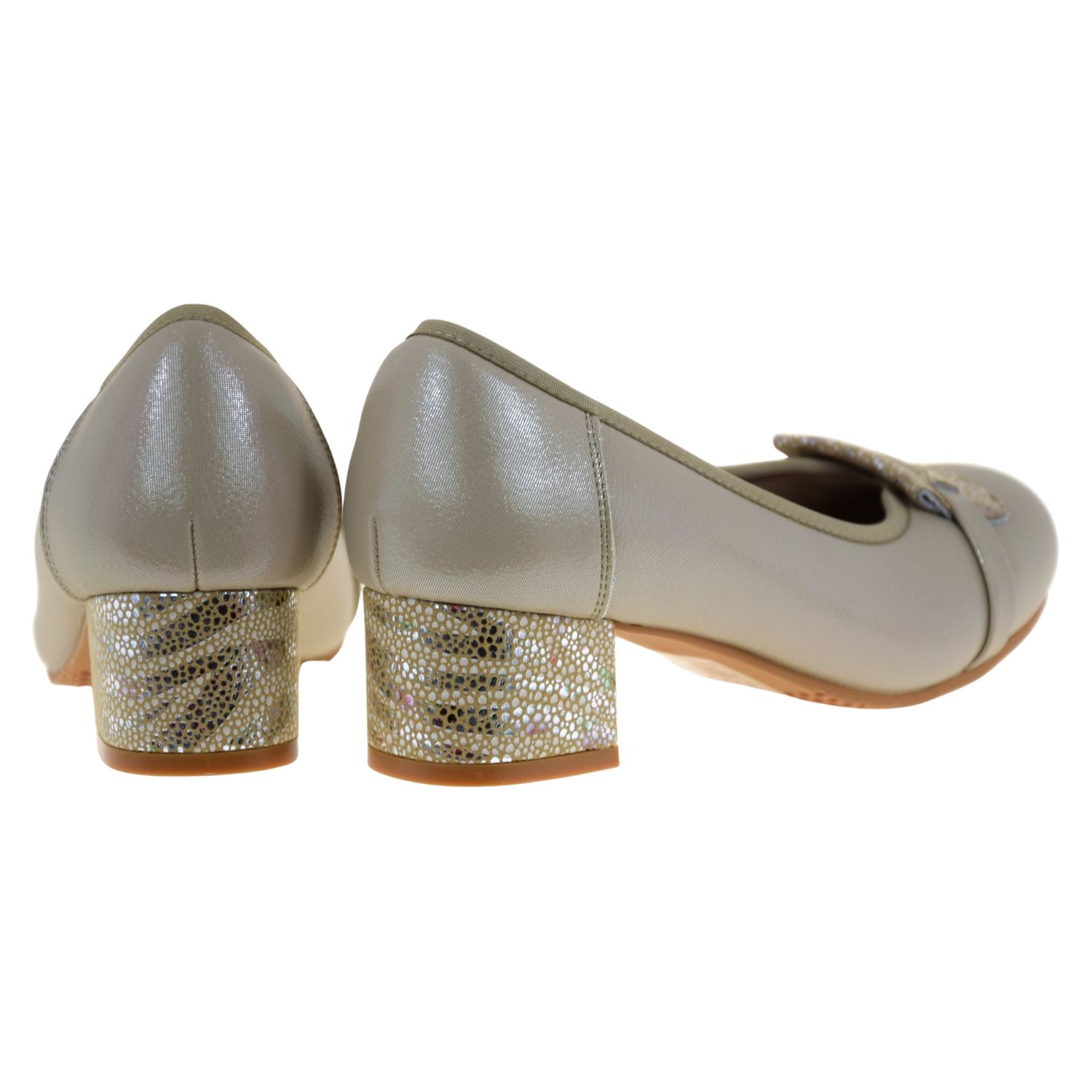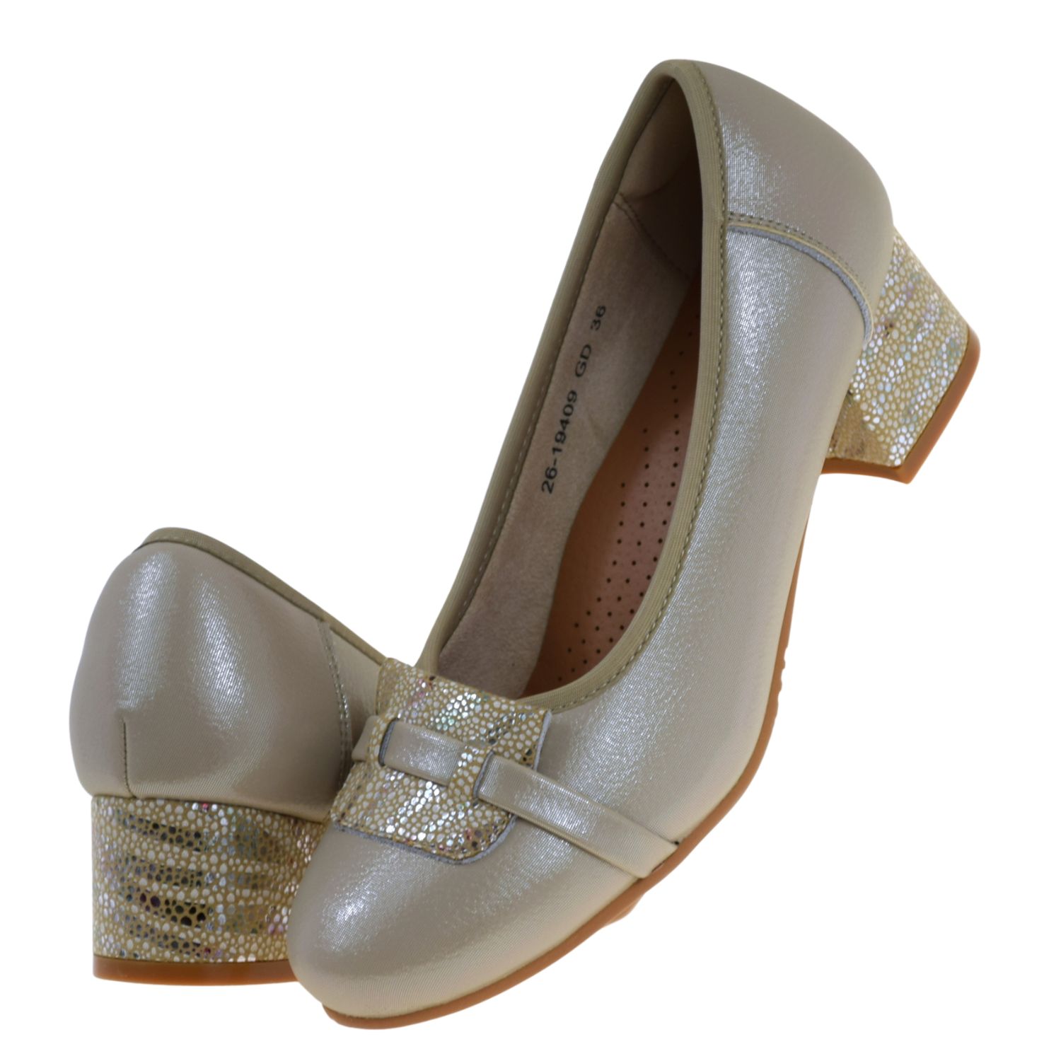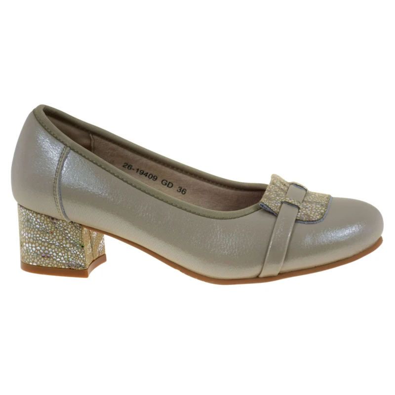 Cholewka została wykonana z naturalnej skóry licowej, dzięki czemu buty prezentują się wyjątkowo estetycznie i elegancko. Delikatnie połyskująca powierzchnia w odcieniu perłowego złota sprawia, że model wygląda kobieco, szykownie i bardzo stylowo. Uwagę zwraca także dekoracyjny element z przodu oraz efektowny, stabilny obcas typu klocek z modnym wzorem, który nadaje czółenkom wyjątkowego charakteru.