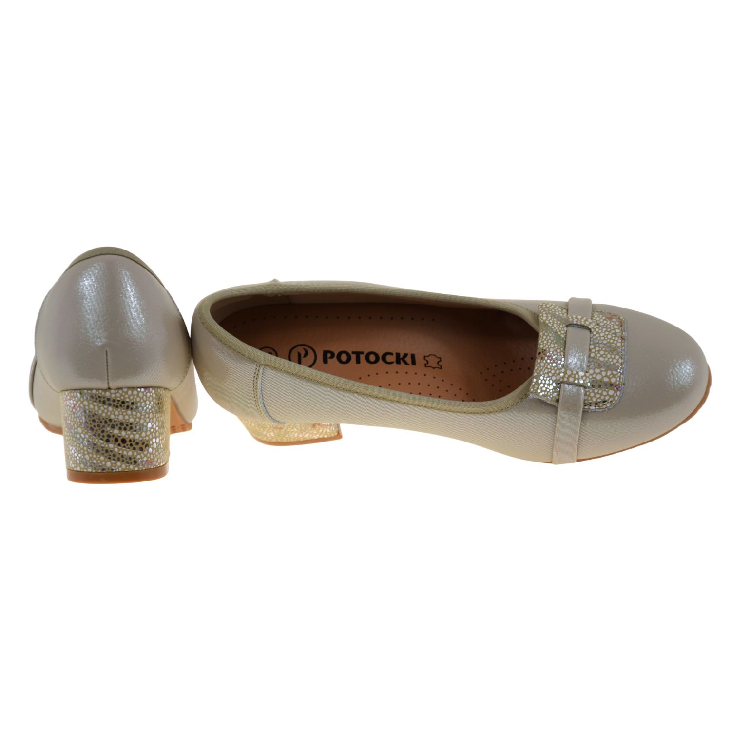Eleganckie czółenka damskie POTOCKI 26-19409GD – złote / perłowe czółenka skórzane na słupku