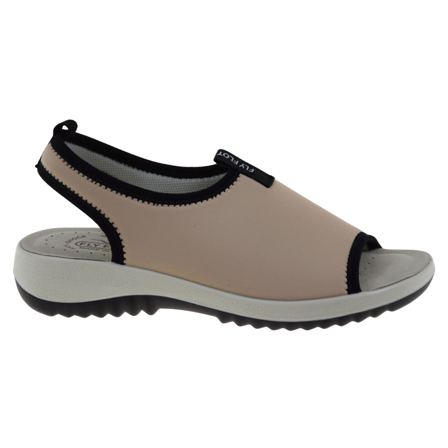 Sandały damskie FLY FLOT 57 H87 LA to lekki, wygodny model dla kobiet, które szukają obuwia miękkiego, przewiewnego i nieuciskającego. Beżowa cholewka z elastycznej, rozciągliwej lycry delikatnie dopasowuje się do stopy, dlatego sandały sprawdzą się jako buty na haluksy, sandały na wrażliwe stopy, sandały na szerokie stopy oraz przy młoteczkowych palcach.