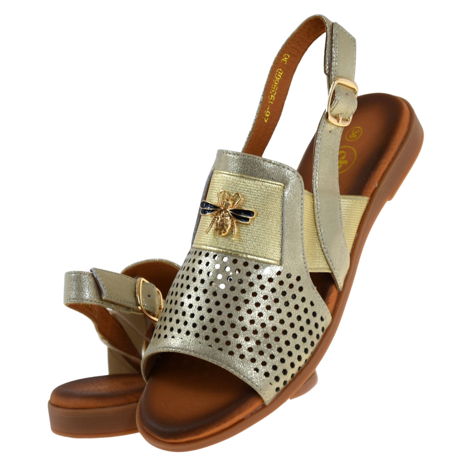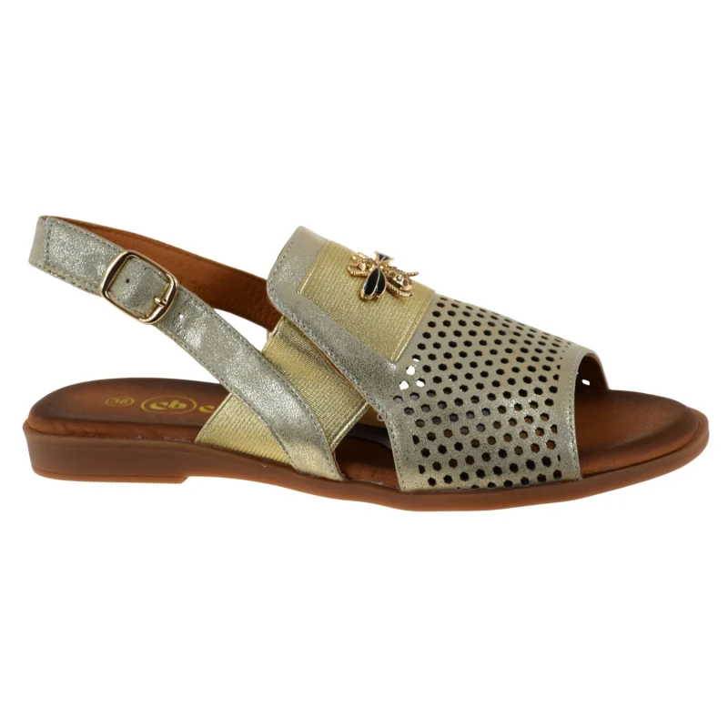 Złote sandały damskie CAMBELL 26-19396GD to propozycja dla kobiet, które szukają połączenia elegancji, wygody i ponadczasowego letniego stylu. Model dostępny w sklepie pandaobuwie zachwyca subtelnym połyskiem naturalnej skóry licowej, lekką ażurową cholewką oraz dekoracyjną ozdobą w kształcie złotego owada. To obuwie, które pięknie prezentuje się na stopie i doskonale uzupełnia zarówno wizytowe, jak i codzienne stylizacje.